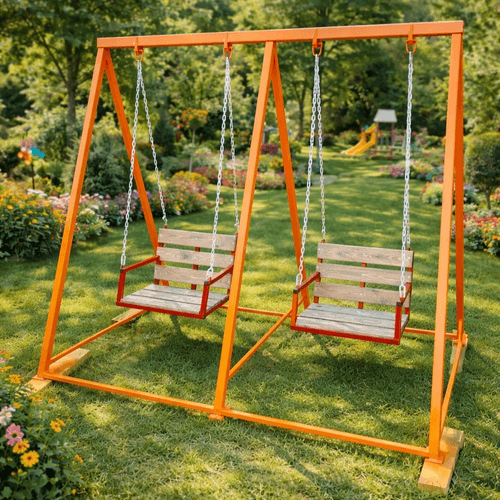 👧👦 Dy luhatëse cilësore – kombinim i drurit dhe metalit, të mbajtura me zingjirë të fortë për siguri dhe stabilitet