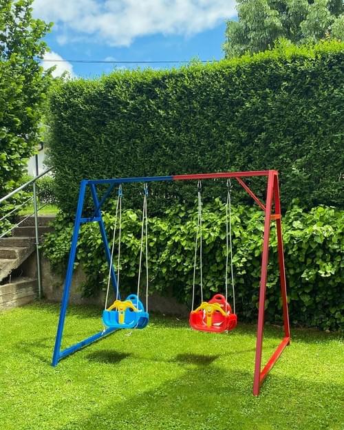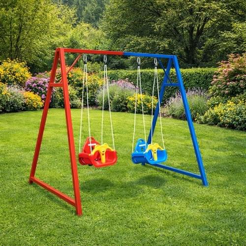 Hulaja për dy fëmijë është ndërtuar me një konstruksion të fortë metalik, duke garantuar stabilitet dhe jetëgjatësi maksimale. Për sigurinë dhe rehatinë e fëmijëve, ajo është e pajisur me dy luhatëse plastike cilësore, të dizajnuara për një përvojë të rehatshme dhe të sigurt gjatë lojës. Ngjyrosja profesionale dy-shtresore dhe antikorizonale siguron mbrojtje maksimale nga faktorët e jashtëm, duke e bërë këtë hulajë rezistente ndaj shiut, borës dhe rrezeve të diellit, për përdorim të gjatë në çdo sezon.